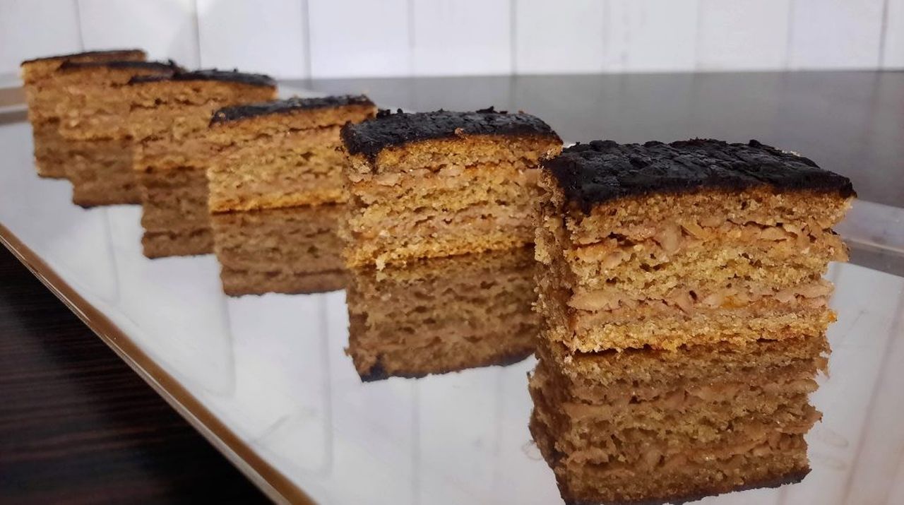 Ha teljesen kihűlt az egész sütemény, akkor levágjuk a széleket, majd a maradékot kb. 4 cm széles csíkokra vágjuk, majd ezeket a csíkokat kb. 2 cm szélesre vágjuk.