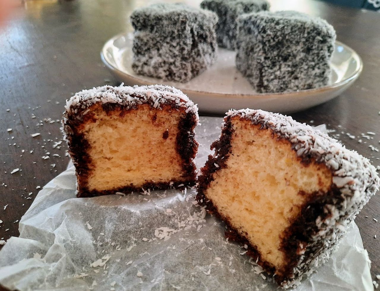 Elkészítjük a piskótát. A tojások sárgáját a cukorral és a langyos vízzel habosra verjük úgy, hogy a vizet csak apránként öntjük hozzá. Addig verjük, amíg a cukor el nem olvad. Nagyon fontos, hogy ne legyen benne cukor szemcse! Belekeverjük a sütőporos lisztet. A tojásfehérjéket is kemény habbá verjük és a keverékbe óvatosan belekeverjük. Egy 35×25 cm-es 5 cm magas tepsibe szilikonos sütőpapírt terítünk és beleöntve a piskótát 180 o C-on előmelegített sütőben alul-felül sütéssel megsütjük kb. 30 perc alatt (tűpróba). A megsült piskótát kihűtjük, majd 5x5 cm-es kockákra vágjuk.